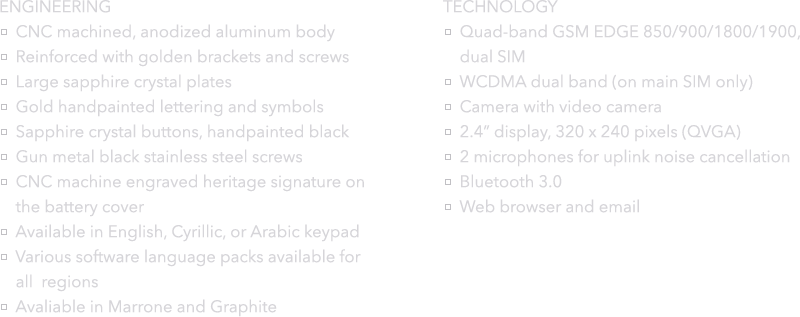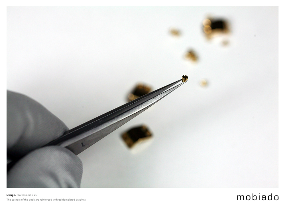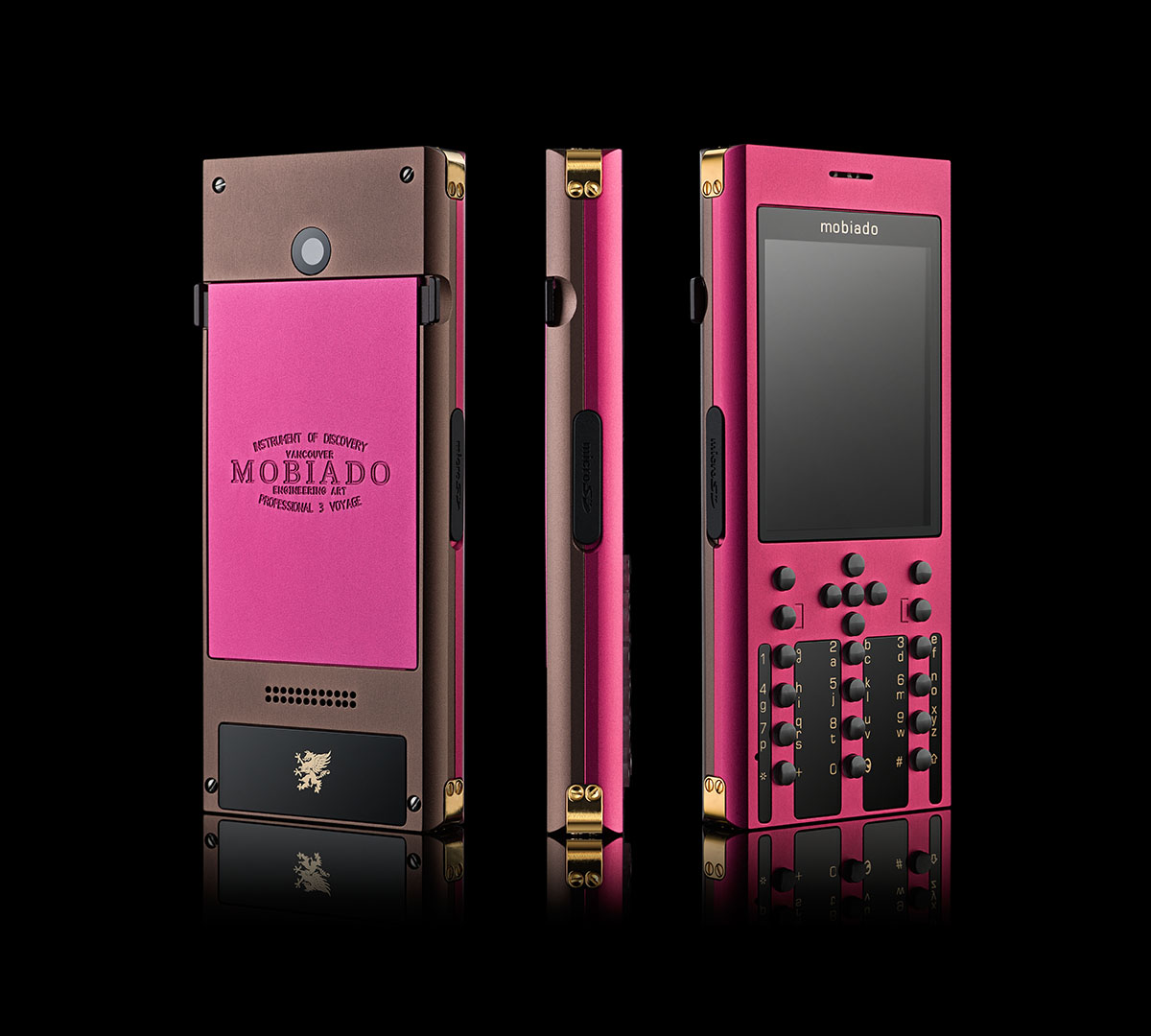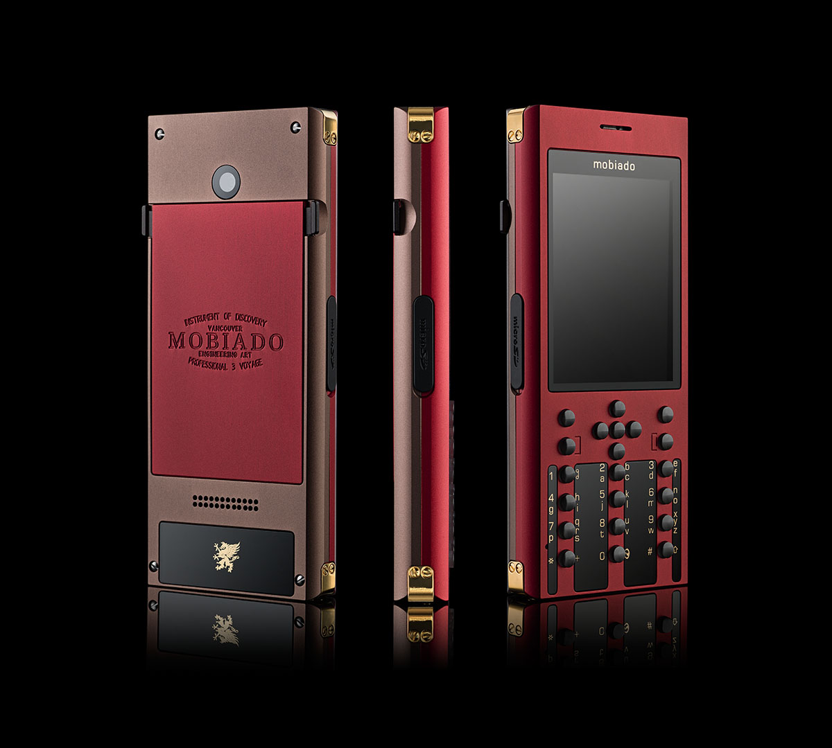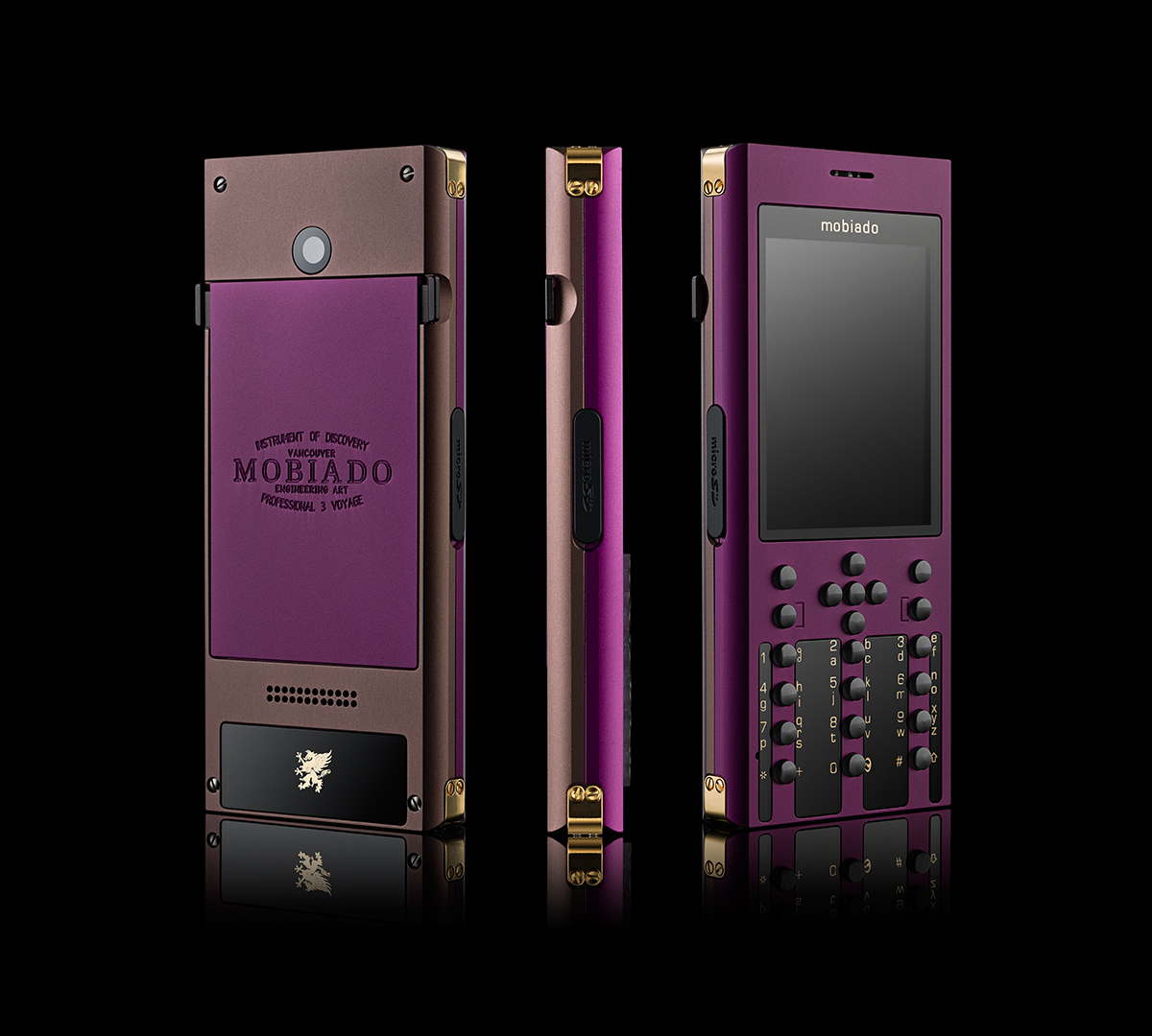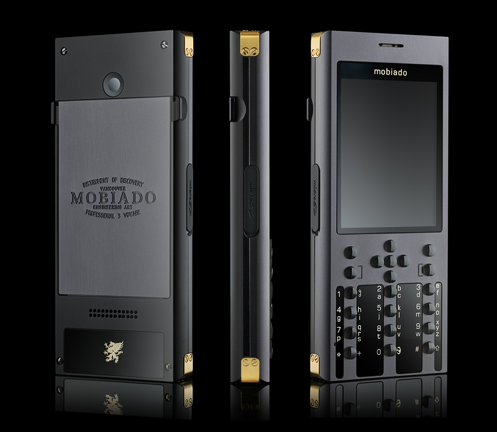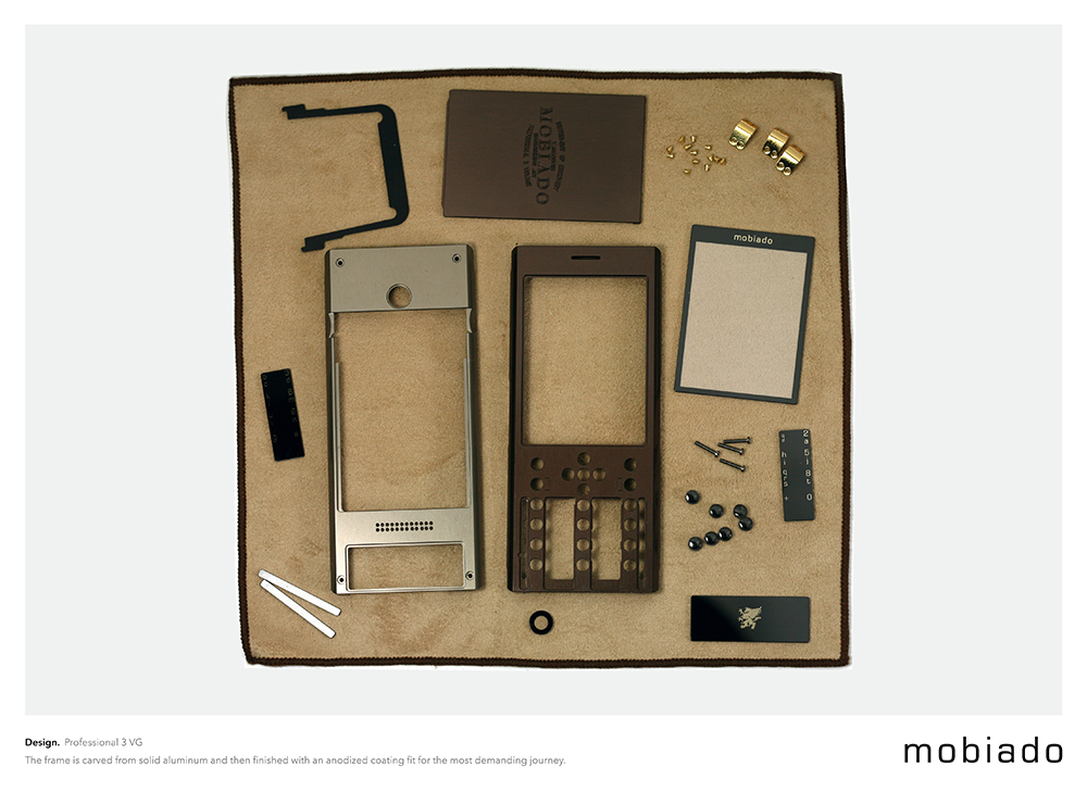 Begin your voyage with the Professional 3 VG. A voyage is not a trip or a vacation. It is a process of self-discovery, showing us not only the world but how we fit within it. The Professional 3 VG frame is carved from solid aluminum and then finished with an anodized coating fit for the most demanding journey. Large sapphire crystal plates and sapphire buttons are precision inset into the body. The battery cover is machine engraved with the heritage Mobiado signature and the corners of the body are reinforced with gold plated brackets. Available in two sleek contemporary choices: Marrone and Graphite.